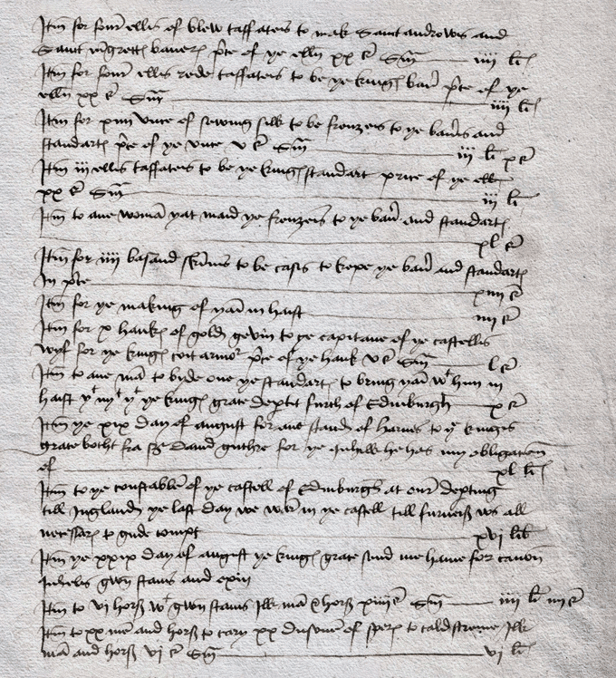 This extract from the Treasurer’s Accounts describes last minute arrangements to buy cloth to make banners and standards for the army, to buy gold thread to decorate the king’s armour with details of the cost to transport lighter weapons to Coldstream.